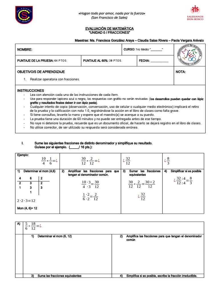 Evaluacion Primero Medio Unidad 0 Fracciones Pdf Sustraccion Multiplicacion